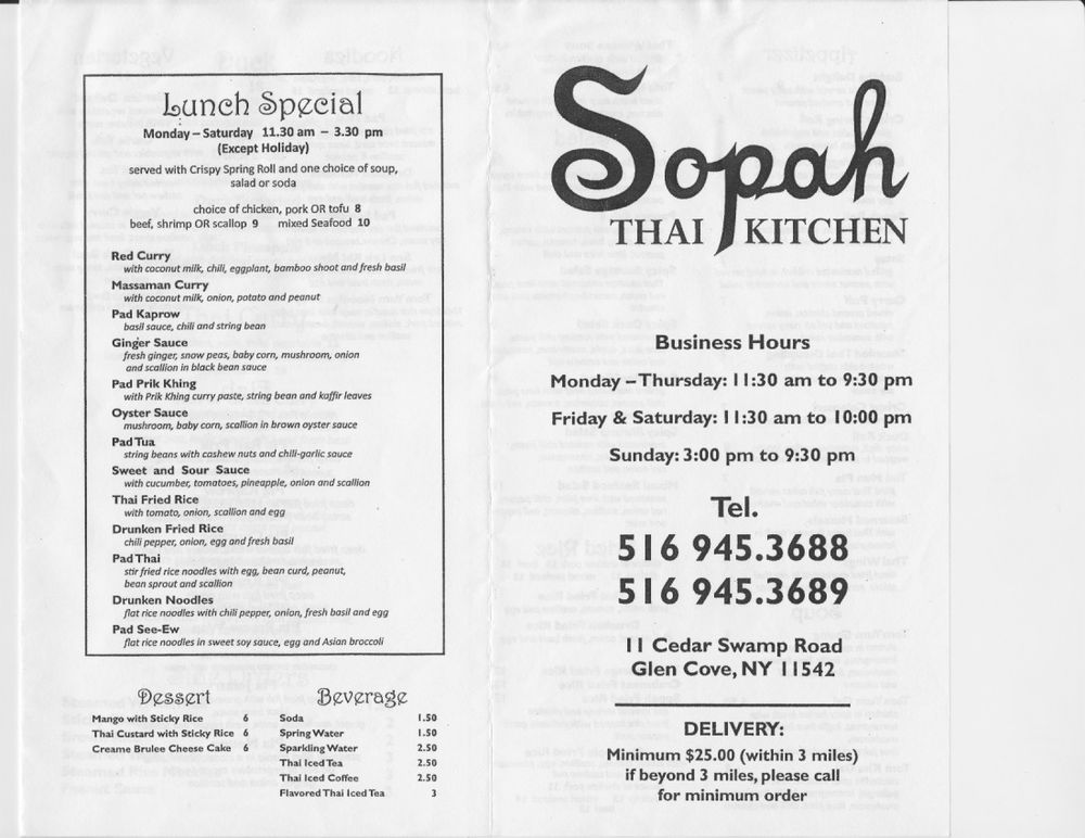 Sopah Thai Kitchen located in Glen Cove, NY, offers a wide range of Thai dishes with options for vegans and various payment methods, including cryptocurrency. Their menu includes appetizers like Chicken Satay and Thai Dumplings, refreshing salads like Thai Salad and Spicy Beef Salad, and flavorful fried rice dishes. Customers praise the quality and freshness of the food, highlighting favorites such as Pad Thai and Green Curry. The cozy ambiance and quick service make it a go-to spot for authentic and delicious Thai cuisine. Whether dining in or opting for takeout or delivery, Sopah Thai Kitchen delivers a satisfying culinary experience with every bite. This restaurant stands out for its attention to detail, friendly service, and mouthwatering dishes that keep customers coming back for more.